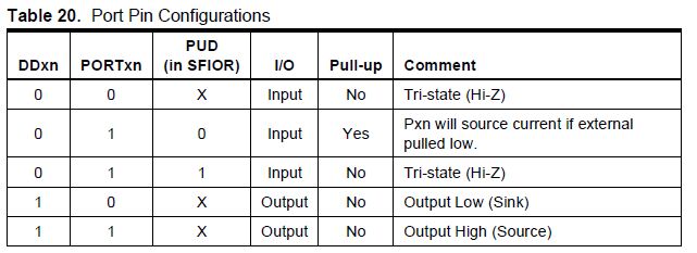 PIN -> (PINA , PINB , PINC , PIND , ...etc) |Address|NAME|bit7|bit6|bit5|bit4|bit3|bit2|bit1|bit0| |:---------:|:-------|:-------|:-------|:-------|:-------|:-------|:-------|:-------|:-------| |0x18 (0x38)| PORTB | PORTB7 | PORTB6 | PORTB5 | PORTB4 | PORTB3 | PORTB2 | PORTB1 | PORTB0 | |0x17 (0x37)| DDRB | DDB7 | DDB6 | DDB5 | DDB4 | DDB3 | DDB2 | DDB1 | DDB0 | |0x16 (0x36)| PINB | PINB7 | PINB6 | PINB5 | PINB4 | PINB3 | PINB2 | PINB1 | PINB0 | |Hardware Pin| -> |Pin7|Pin6|Pin5|Pin4|Pin5|Pin4|Pin3|Pin0| |############|#######|########|########|########|########|########|########|########|########| AS we see Every PORT ( 8 hardware Pins ), has 3 control registers after its name (PORT , DDR , PIN) Each is 8-bit Register, where every "bit 0-7" is mapped to the corresponding "Pin 0-7"