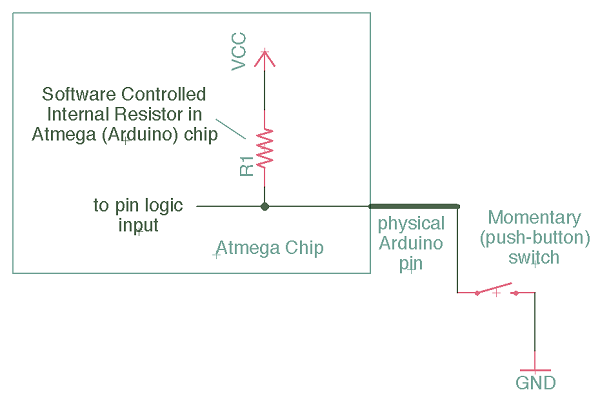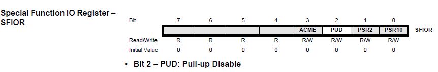 to enable PUD bit-2 in the SFIOR , its enabled by default "PUD = 0b0" if "PUD = 0b1" , the Pull-up is Disabled System wide To activate the Pull-up option you need to configure the Input pin with extra configuration