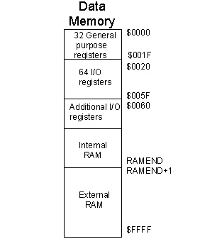 - Data Memory Holds data used by the program (i.e Variables, tables , pointers, structures, constants, Logs ...etc). This is amount is limited to only 1024 bytes in the ATmega8 family.